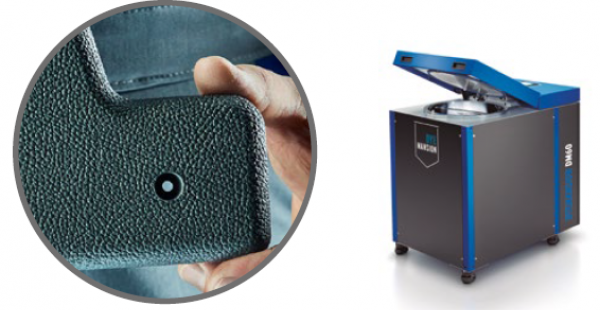 然后使用DyeMansion的Powershot S設(shè)備進(jìn)行表面處理,因?yàn)镾LS工藝尼龍打印的特性,打印件表面會(huì)稍顯粗糙。經(jīng)過(guò)表面處理后,打印件表面會(huì)比較光滑且具有磨砂效果。