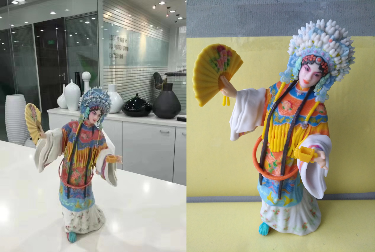 我們利用三維掃描技術(shù),快速高效的完成了戲曲人物的數(shù)據(jù)采集工作,包括華麗的戲服,復(fù)雜的頭飾等,為后期3D打印提供了高質(zhì)量的數(shù)據(jù)保障。同時我們采用了彩色3D打印技術(shù),完成了《貴妃醉酒》的禮品。因該項目過程客戶要求保密,在此僅分享禮品的成品照片。