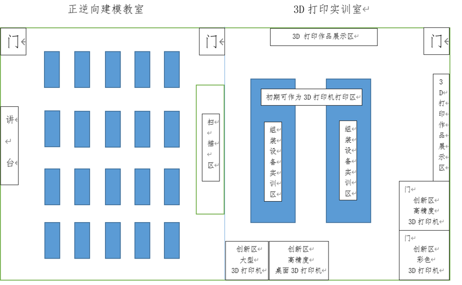 北京某學(xué)院3D打印實(shí)訓(xùn)室 根據(jù)校方要求,我們了解到3D打印實(shí)訓(xùn)室總規(guī)劃面積為200 m2。根據(jù)實(shí)訓(xùn)室的用途,需要采購(gòu)的設(shè)備,可分為五大區(qū)域 實(shí)訓(xùn)室布局規(guī)劃 根據(jù)校方要求,我們了解到3D打印實(shí)訓(xùn)室總規(guī)劃面積為200 m2。根據(jù)實(shí)訓(xùn)室的用途,需要采購(gòu)的設(shè)備,可分為五大區(qū)域: 展示區(qū) 三維模型設(shè)計(jì)區(qū) 逆向成型設(shè)計(jì)區(qū) FDM組裝與調(diào)試區(qū) 3D打印創(chuàng)新區(qū) 部分設(shè)備介紹 Artec/EVA 彩色手持三維掃描儀 可提供快速、準(zhǔn)確、肌理豐富的完美3D掃描。掃描過程迅速,色彩鮮亮,分辨率高,幾乎可用于所有場(chǎng)合,且輕便、快捷、多功能 適用于掃描藝術(shù)類等不規(guī)則、大型作品的掃描 FARO?DESIGN SCANARM 高精度三維掃描臂 采用光學(xué)領(lǐng)域中領(lǐng)先的藍(lán)色激光技術(shù),具有極高的掃描速度,可生成高分辨率點(diǎn)云數(shù)據(jù),無(wú)需貼點(diǎn) ?? 適用于掃描工業(yè)類等精密零件掃描 YUNS?Y100組裝打印機(jī) 結(jié)構(gòu)簡(jiǎn)單,是3D打印入門級(jí)設(shè)備,價(jià)格便宜 交由學(xué)生拆裝,了解設(shè)備結(jié)構(gòu),學(xué)習(xí)3D打印成型原理 YUNS Y300桌面FDM打印機(jī) 打印尺寸大,成型速度快,適合中小批量打印 可批量打印學(xué)生創(chuàng)意作品 UNIZ桌面機(jī) DLP樹脂打印,大成型尺寸,高精度打印、高表面質(zhì)量、全自動(dòng)支撐生成 可直接打印學(xué)生畢業(yè)設(shè)計(jì)等高精度模型 Ultra?3SP 全新的3SP?(掃描、旋轉(zhuǎn)、選擇性光固化)技術(shù),從STL文件快速精準(zhǔn)地打印輸出。使用多腔二極管激光器的操作成本低;最少的材料損耗降低成本。較大的成型空間 工業(yè)級(jí)精度,可直接生產(chǎn)出誤差內(nèi)的成型零件 Objet260 樹脂噴射彩色3D打印機(jī),可使用一系列多種材料組件(包括剛性、柔性、透明和耐用組件)創(chuàng)建顏色鮮亮的原型 色彩豐富,成品無(wú)需上色 最終結(jié)果 3D打印實(shí)驗(yàn)室功能實(shí)現(xiàn): 設(shè)計(jì)可以在較短的時(shí)間很快實(shí)現(xiàn)并得到驗(yàn)證及完善設(shè)計(jì),充分發(fā)揮設(shè)計(jì)創(chuàng)造力; 結(jié)合3D打印實(shí)驗(yàn)室配置的設(shè)備,可充分有效的將自身設(shè)計(jì)的物品制作出來(lái),創(chuàng)造產(chǎn)品真實(shí)呈現(xiàn)給人們; 基于空間內(nèi)的設(shè)備設(shè)施,可用于創(chuàng)客體驗(yàn)、培訓(xùn)、競(jìng)賽、技術(shù)交流等; 整個(gè)制作過程在3D打印實(shí)驗(yàn)室內(nèi)完成,可用于教學(xué),提升人員自身技能及拓寬生產(chǎn)制造思路。 更多詳情請(qǐng)點(diǎn)擊——教育科研 上頁(yè) 下頁(yè)