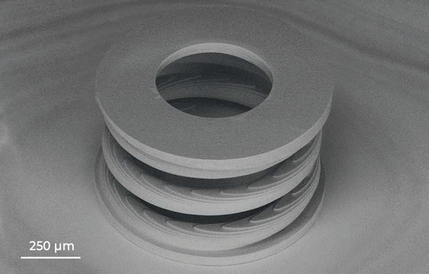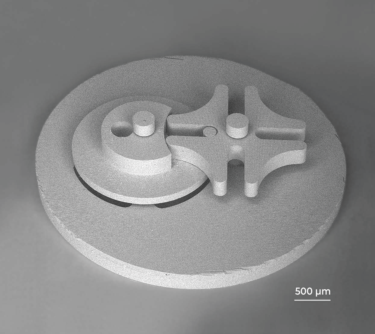 ? ? ? 日內(nèi)瓦齒輪是一種任意形狀的微機(jī)械部件,是產(chǎn)生間歇性旋轉(zhuǎn)運(yùn)動(dòng)常用的裝置之一。包含兩個(gè)相互嚙合的元件。通過(guò)將一個(gè)齒輪旋轉(zhuǎn) 360°,另一個(gè)齒輪以固定的 90°增量移動(dòng)。? ? ? 使用 SLE 技術(shù),這些機(jī)構(gòu)可以由單片玻璃制成,而不需要組裝步驟。由于無(wú)需組裝該結(jié)構(gòu)可以小規(guī)模生產(chǎn)(低至數(shù)百微米)而無(wú)需復(fù)雜的微操作。此外,通過(guò)將一個(gè)小磁體連接到機(jī)構(gòu)上并將其放置在旋轉(zhuǎn)磁體上,可以實(shí)現(xiàn)結(jié)構(gòu)的平穩(wěn)連續(xù)運(yùn)動(dòng)。這是由于結(jié)構(gòu)的不同運(yùn)動(dòng)部件之間的間隙非常小 (<10 μm) 和很好的表面粗糙度 (~200 nm RMS) ,更大限度地減少了過(guò)度摩擦。