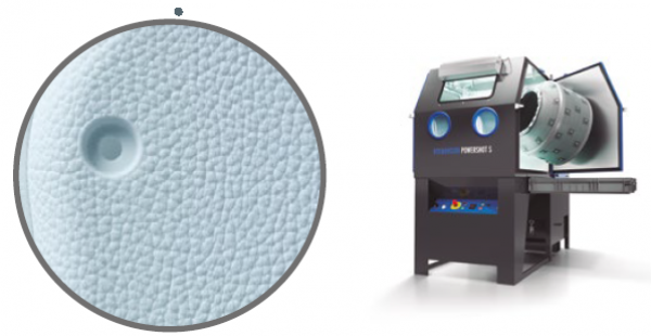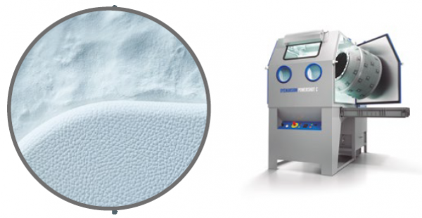 然后使用DyeMansion的Powershot S設(shè)備進(jìn)行表面處理,因?yàn)镾LS工藝尼龍打印的特性,打印件表面會(huì)稍顯粗糙。經(jīng)過(guò)表面處理后,打印件表面會(huì)比較光滑且具有磨砂效果。