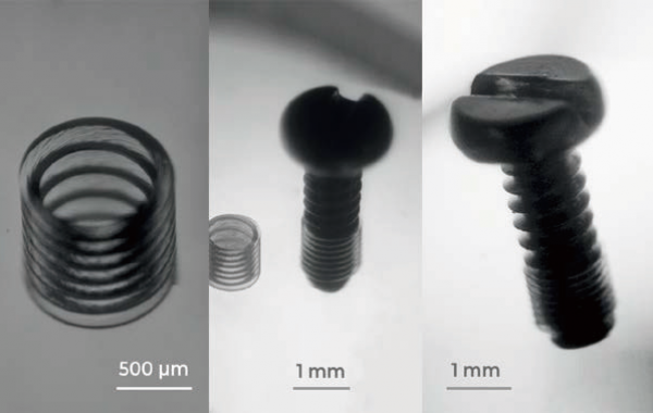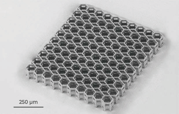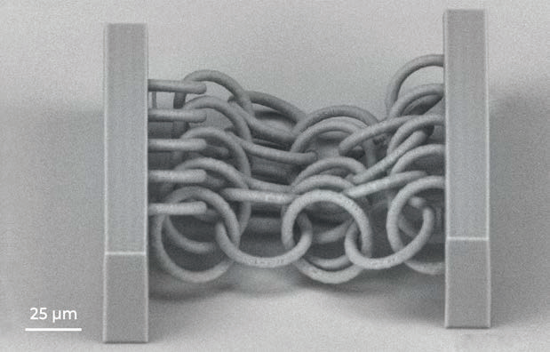 ? ? ? 多光子聚合 (MPP) 是一種適合于超材料制備的技術(shù)。超材料是一種復(fù)合材料,其物理特性與所用材料的物理性能不同。? ? ? 三維螺旋結(jié)構(gòu)在機(jī)械上是剛性的,但很輕。該結(jié)構(gòu)是通過(guò)使用加寬物鏡工作距離 (WOW) 方法制造的,利用該方法可以增加高數(shù)值孔徑物鏡的工作距離。該結(jié)構(gòu)的總體尺寸-為1mmx1mmx1mm。結(jié)構(gòu)高度遠(yuǎn)大于所用物鏡的工作距離(0.19 mm)。? ? ? 這種微制造技術(shù)使制造中尺度結(jié)構(gòu)成為可能,這些結(jié)構(gòu)的總尺寸比其最基本特征大幾個(gè)數(shù)量級(jí),