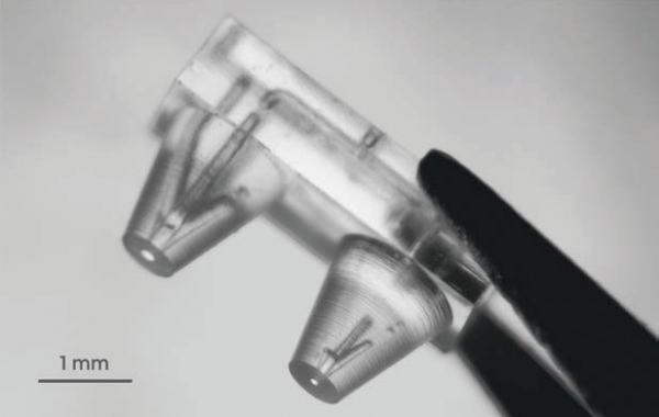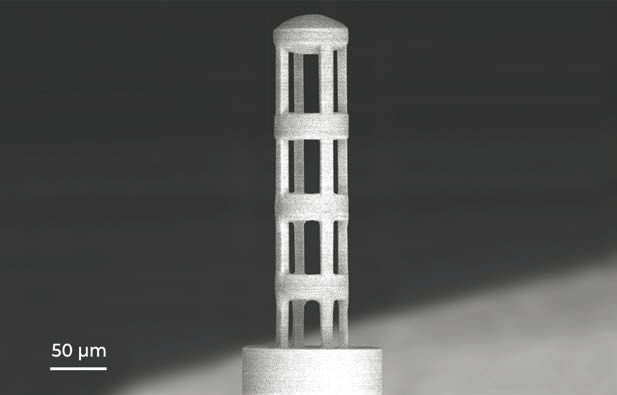 ? ? ? 多光子聚合 (MPP: Multiphoton-polymerization) 是一種能夠在亞微米分辨率下生產(chǎn)任意形狀聚合物結(jié)構(gòu)的 3D 打印技術(shù)。首先,通過(guò)在載玻片上滴注與光引發(fā)劑混合的聚合物材料,然后預(yù)烘焙,制備光致抗蝕劑樣品。然后,使用激光直寫技術(shù)來(lái)制造 3D 微結(jié)構(gòu)。因此,由于一種稱為光聚合的過(guò)程,聚合物在受到激光輻射影響的下落處硬化。最后,將微結(jié)構(gòu)浸入有機(jī)溶劑中以顯影未聚合的光致抗蝕劑。? ? ? MPP 通常用于微電子器件的制造,因?yàn)樗试S創(chuàng)建非常小的以及高精度的詳細(xì)結(jié)構(gòu)此外,由于光線高度聚焦,因此可用于創(chuàng)建復(fù)雜的 3D 形狀。